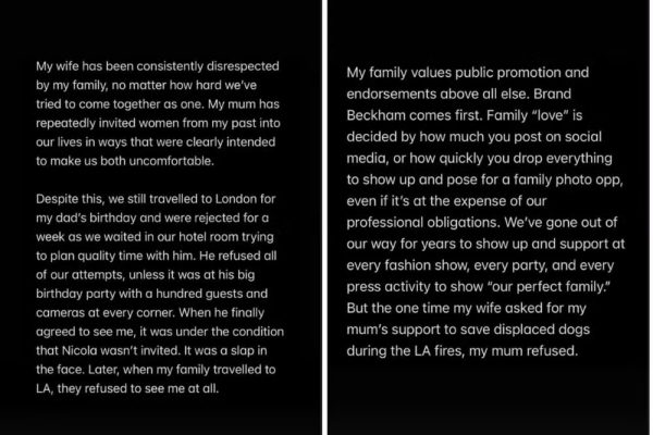 Brooklyn Beckham publicou um longo desabafo nas redes sociais nesta segunda-feira (19), no qual fez críticas diretas aos pais, David Beckham e Victoria Beckham, e afirmou que não pretende se reconciliar com a família. Em uma sequência de stories no Instagram, ele disse que permaneceu em silêncio por anos, mas decidiu se manifestar após, segundo ele, seus pais e a equipe deles continuarem a procurar a imprensa. “Eles são capazes de plantar inúmeras mentiras na mídia para preservar a própria imagem”, escreveu.
