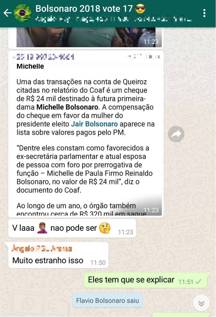 O caso virou assunto em um grupo de WhatsApp formado por apoiadores de Bolsonaro do qual Flávio fazia parte.