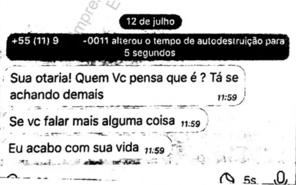 Ela entregou aos policiais civis cópias de mensagens de texto trocadas por meio de um aplicativo, em que o parlamentar afirma que vai acabar com a vida dela e lhe dirige palavras como “otária”, “abusada”, “vagabunda” e “p…”. Procurada, a assessoria do deputado disse que ele não se manifestaria porque ainda não foi notificado.