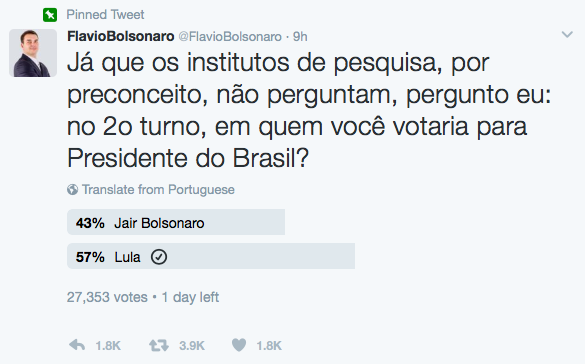Um dia depois da publicação da pesquisa CNT dando Lula na liderança ele resolveu colocar em suas redes sociais a seguinte enquete: