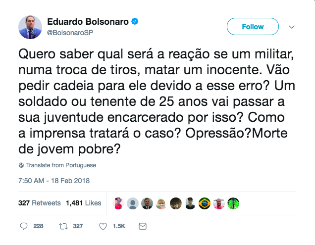 Filho de Bolsonaro pergunta “qual será a reação se um militar matar um inocente” e se solidariza com o assassino
