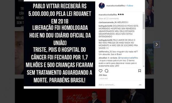O filho de Marcelo Crivella, Marcelo Hodge Crivella, embarcou em um boato divulgado nas redes sociais e compartilhou uma postagem no Instagram que traz um notícia falsa. No post, há a afirmação de que a cantora Pablo Vittar receberá R$ 5 milhões em 2018 por meio da Lei Rouanet. O filho de Crivella compara o benefício à difícil situação do Hospital do Câncer, em Barretos (SP), que chegou a ficar um mês fechado este ano.