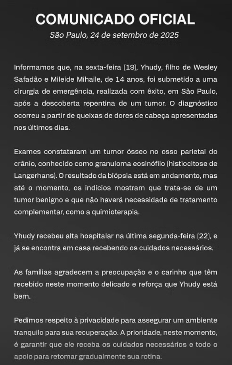 O filho de Wesley Safadão e Mileide Mihaile, Yhudy, de 14 anos, foi submetido a uma cirurgia de emergência após a descoberta de um tumor no cérebro. O adolescente vinha relatando fortes dores de cabeça, o que levou a família a procurar atendimento médico e resultou no diagnóstico.