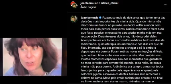 João Lee também prestou uma homenagem à mãe e contou sobre a decisão de voltar a morar com os pais depois que a cantora descobriu um tumor no pulmão.