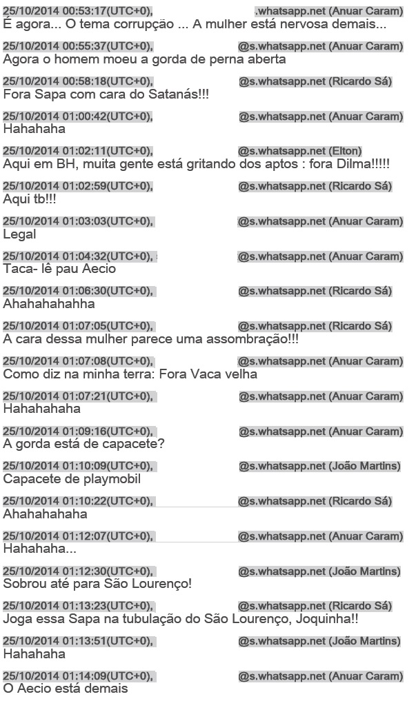 (…) “Legal. Taca-lê pau Aécio”, segue Anuar Caram. As ofensas e piadas à presidente seguem durante o debate transmitido pela TV Globo. No dia seguinte, após a votação do segundo turno, o grupo começa a comentar as expectativas e a torcer pelo candidato tucano, citando inclusive informações que seriam da campanha dele.