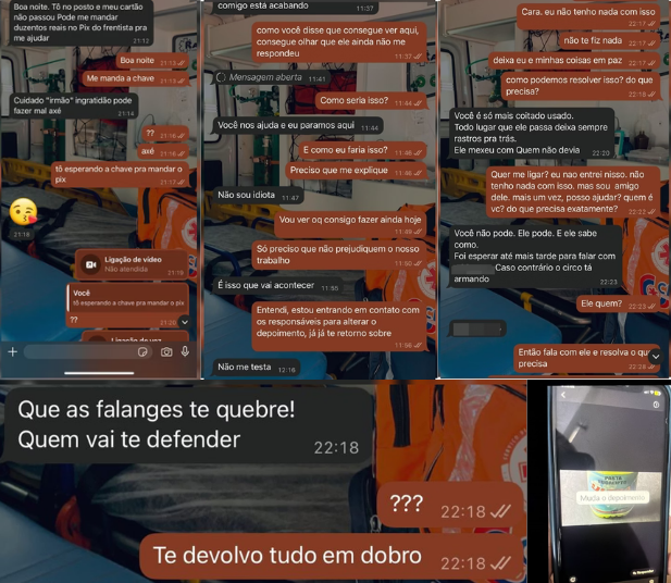 As vítimas também relatam perseguições e mensagens de intimidação enviadas pelos chamados “filhos de santo”. Em um dos casos, uma mulher recebeu a foto de um veneno acompanhada da frase “muda o depoimento”. Outras mensagens sugerem que entidades espirituais agiriam contra as denunciantes.