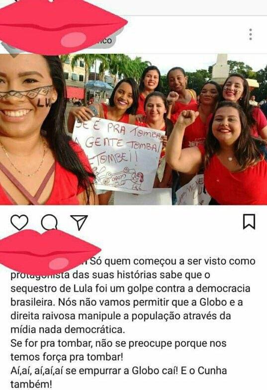 Apoiadora do movimento Fora Temer, é militante de direitos e humanos, ela dividiu opiniões por fotos com o ex-presidente Lula. A ‘descoberta’ mais recente dos internautas é uma foto sua segurando um cartaz anti-Globo com os dizeres “Se é pra tombar! Tombei!!” – e o desenho de um carro da Rede Globo tombado e pessoas aparentemente destruindo o veículo.