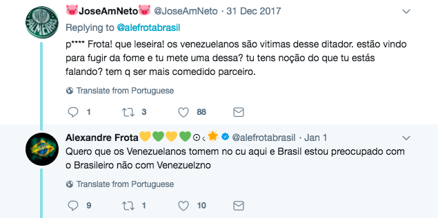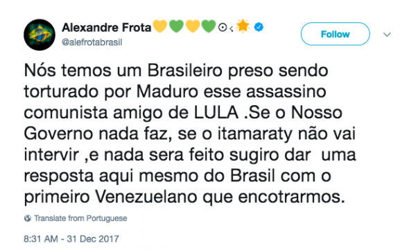 “Se nosso governo nada faz […] sugiro dar uma resposta aqui mesmo do Brasil [sic] com o primeiro venezuelano que encontrarmos”, escreveu no Twitter, manifestando solidariedade ao brasileiroJonatan Diniz, preso na Venezuela.