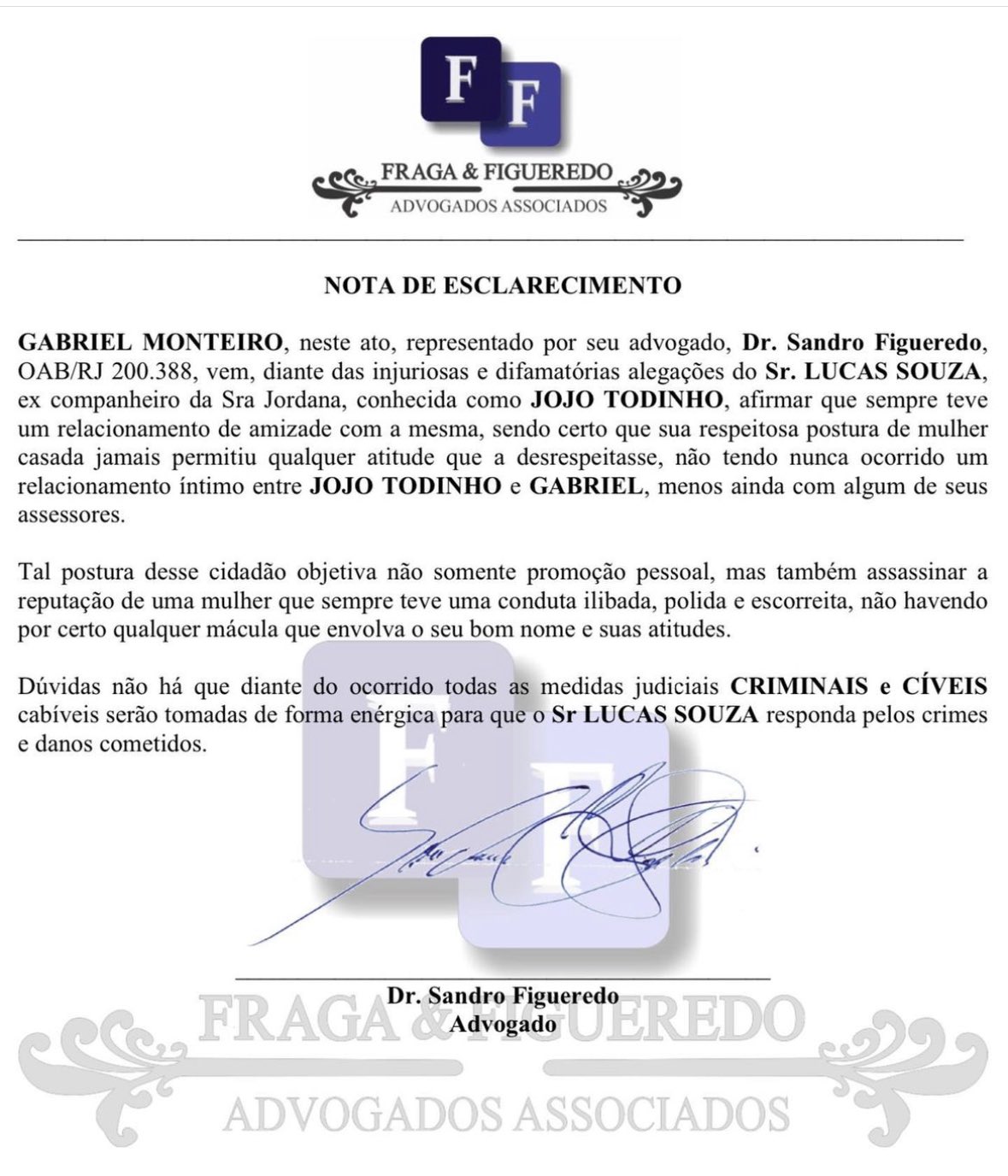 Gabriel Monteiro negou negou ter tido um caso com Jojo Todynho. O advogado do ex-vereador, Sandro Figueredo, negou a acusação de Lucas Souza, ex-marido da cantora que disse ter sido traído. A defesa ainda chama as declarações de “injuriosas e difamatórias”.