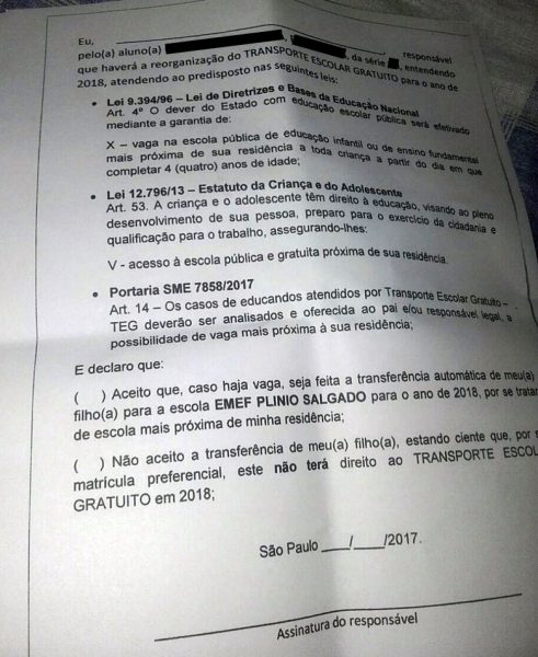 Familiares de alunos de escolas municipais da cidade de São Paulo estão recebendo comunicados da gestão do prefeito da capital paulista, João Doria (PSDB), informando que seus filhos, que hoje utilizam o transporte escolar gratuito (TEG), serão transferidos de escola ou ficarão sem o auxílio em 2018. Mães de estudantes ouvidas pela RBA relataram que não está havendo diálogo, são convidadas pelas diretorias das unidades apenas para assinar o documento, já com o nome das crianças e, em alguns casos, com o nome da escola para onde serão transferidos os alunos.
