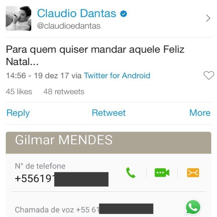 Em dezembro, o repórter divulgou o número do telefone celular do magistrado no Twitter com a frase “Para quem quiser mandar aquele Feliz Natal”. Mendes pede reparação de R$ 100 mil. Dantas não respondeu à coluna.