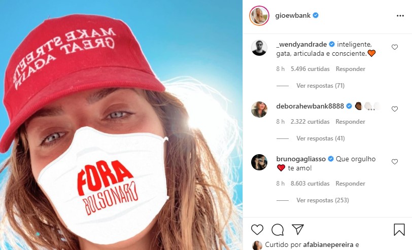 Em meio à polêmica envolvendo a atriz Juliana Paes sobre posicionamento político, Giovanna Ewbank publicou uma foto usando um filtro que simula uma máscara facial dizendo “Fora Bolsonaro”.