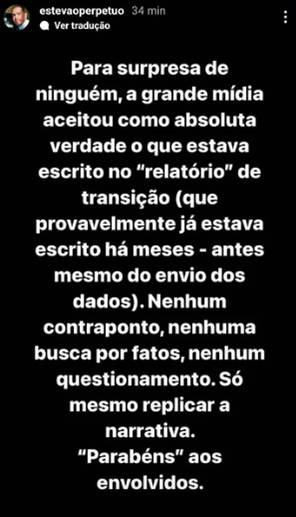 Martins já usou as redes sociais para criticar o relatório da transição do governo Lula sobre a pasta. Ele chamou o documento de “narrativa”.