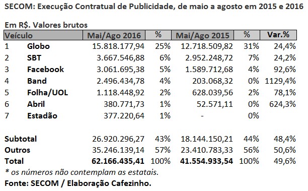 Então fui olhar com mais calma os números da Secom, fazendo o seguinte comparativo: peguei as execuções contratuais (pagamentos efetivamente realizados) neste quatro meses de “governo Temer”, de maio a agosto deste ano, e os comparei com os quatro meses de 2015.