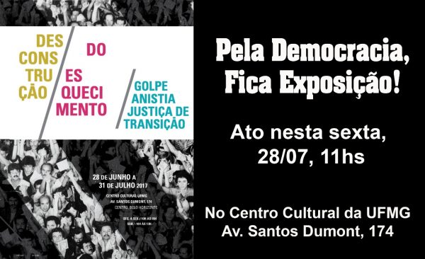Estamos organizando um ato em frente ao Centro Cultural da UFMG na sexta-feira, dia 27, as 11 horas, visando à prorrogação da Exposição “Desconstrução do Esquecimento” para todo o segundo semestre letivo. É muito importante a participação de quem puder.”