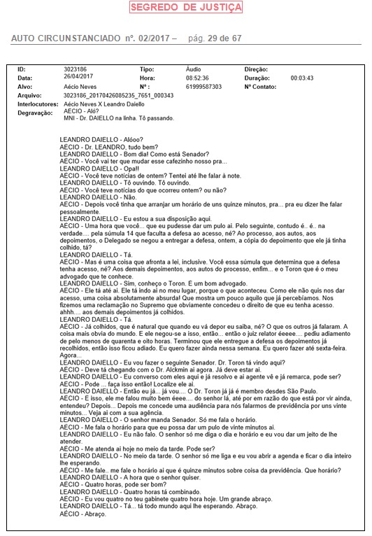 Na data da ligação, 26 de abril, o senador afirma ao diretor-geral da PF que seu advogado, Alberto Zacharias Toron, estava a caminho da sede da corporação. Ele pediu a Daiello para ‘localizar’ Toron quando chegasse ao prédio da PF em Brasília.