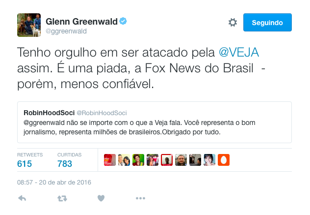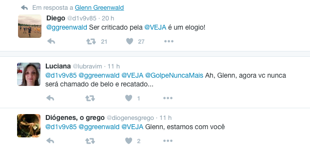 Depois de uma matéria na Veja em que foi acusado de “embarcar no discurso governista” e “flertar com paranoia”, o jornalista Glenn Greewald respondeu à revista no Twitter:
