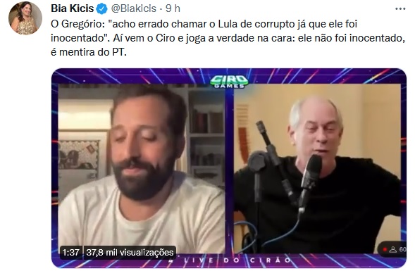 “O Gregório: ‘acho errado chamar o Lula de corrupto já que ele foi inocentado’. Aí vem o Ciro e joga a verdade na cara: ele não foi inocentado, é mentira do PT”, escreveu a parlamentar.