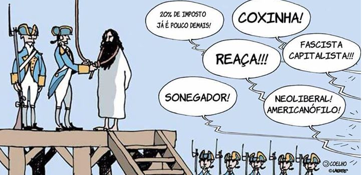 No desenho adulterado pelo MBL, é o contrário: Tiradentes é enforcado aos gritos de “coxinha”, “reaça”, “sonegador”, “fascista capitalista”, “neoliberal! Americanófilo!” e “20% de imposto já é pouco demais!”.