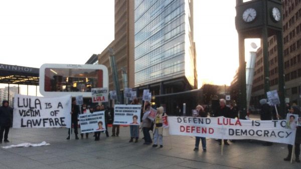 A uma temperatura de 2 graus, um grupo de cerca de 20 pessoas se reuniu na Potsdamer Platz, praça próxima ao Palácio do Festival de Berlim, em um ato simbólico a favor de Lula e contra o impeachment de Dilma. O ato, organizado por redes sociais, era composto sobretudo por brasileiros que moram na Alemanha, além de moradores da Suíça e do Brasil.