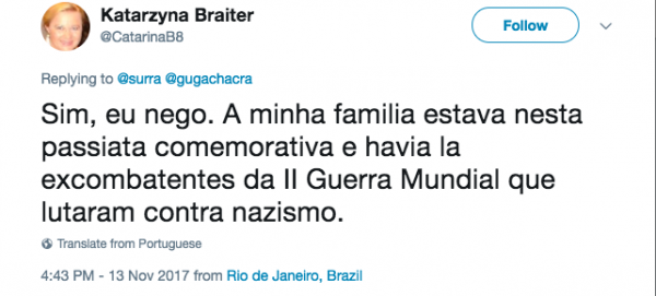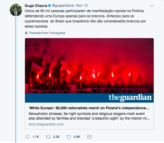 O correspondente da GloboNews em Nova York, Guga Chacra, divulgou em seu Twitter que “cerca de 60 mil pessoas participaram de manifestação nazista na Polônia defendendo uma Europa apenas para os brancos”, repercutindo o jornal inglês The Guardian.