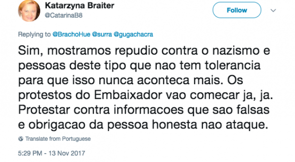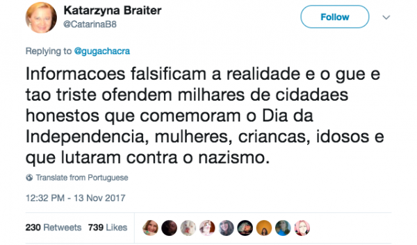 A relações públicas do consulado da Polônia no Brasil, Katarzyna Braiter, não gostou e replicou Guga (num português pior que o de Marco Feliciano). “Como o Senhor persiste nas suas informações falsas?”, escreveu.