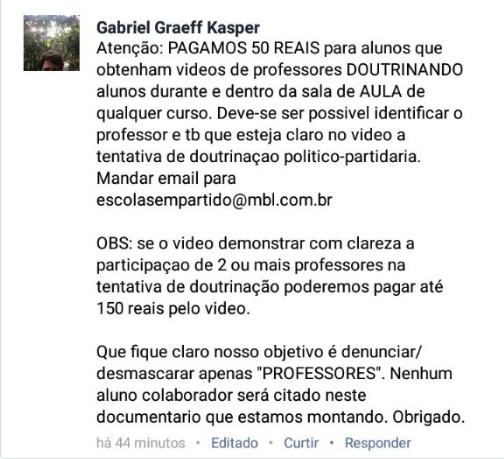 Homem que se diz ligado ao MBL oferece até R$ 150 por vídeo de professores “doutrinando alunos”