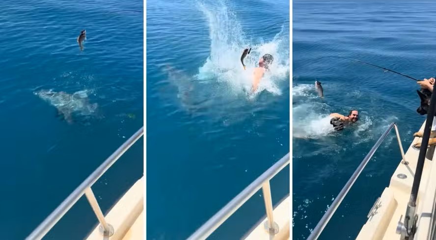 A reação veio de um homem que acompanhava a pescaria. Ele não hesitou e saltou sobre o tubarão, fazendo com que o predador recuasse e desaparecesse em seguida. Entre risos e alívio, os familiares comemoraram o retorno do improvisado “herói” à embarcação.