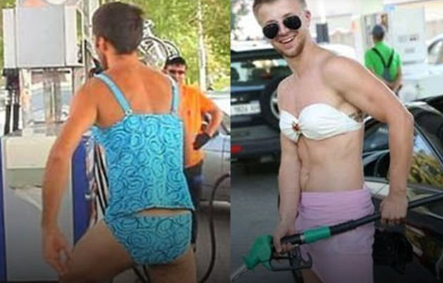 Homens de biquíni invadem posto em promoção por gasolina grátis