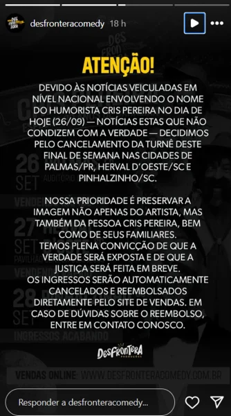 As apresentações estavam marcadas para este fim de semana em Palmas (PR), Herval D’Oeste (SC) e Pinhalzinho (SC). A produtora Desfrontera Comedy confirmou o cancelamento e classificou a condenação como “notícias inverídicas”.