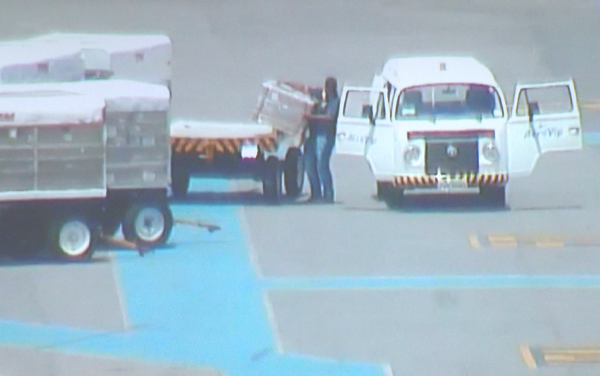 O homem conta com a ajuda de um comparsa, que coloca o carregamento dentro de uma kombi e deixa o pátio das aeronaves. Este ajudante não é funcionário do aeroporto, mas conseguiu entrar no local com o auxílio de um funcionário de uma empresa de alimentos que presta serviço para as companhias aéreas. Os três foram presos em flagrante neste sábado (9).