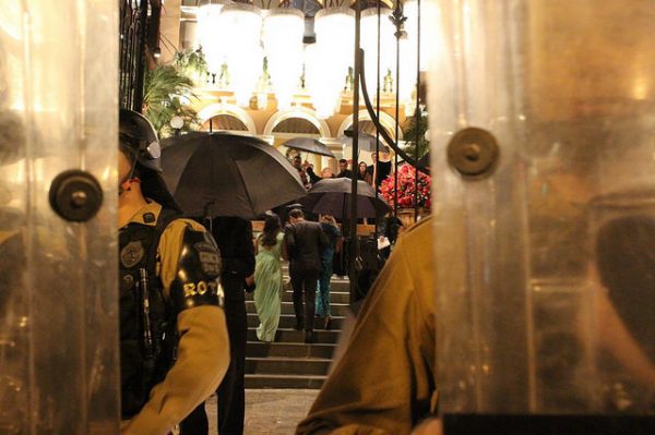 Imagens que vão marcar a revolta: convidados usam guarda-chuva para se proteger dos ovos e tropa de choque da PM faz a segurança da festa.