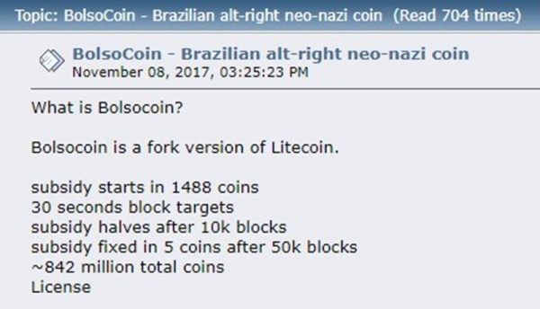 O ano eleitoral começou, e apoiadores de candidatos já fazem campanha das formas mais diversas possíveis. Supostos eleitores do deputado federal Jair Bolsonaro (recém-filiado ao PSL-RJ) escolheram um modo inusitado: a criação da BolsoCoin. Oferecida e divulgada em cantos pouco conhecidos da internet, a invenção é uma criptomoeda vendida por seus criadores como a primeira “da direita alternativa e neonazista do Brasil”.