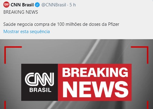 A CNN Brasil foi criticada nas redes sociais nesta terça-feira (20) por usar “Breaking News” ao noticiar que o ministério da Saúde, chefiado por Marcelo Queiroga, está negociando a compra de 100 milhões de doses da vacina da Pfizer.
