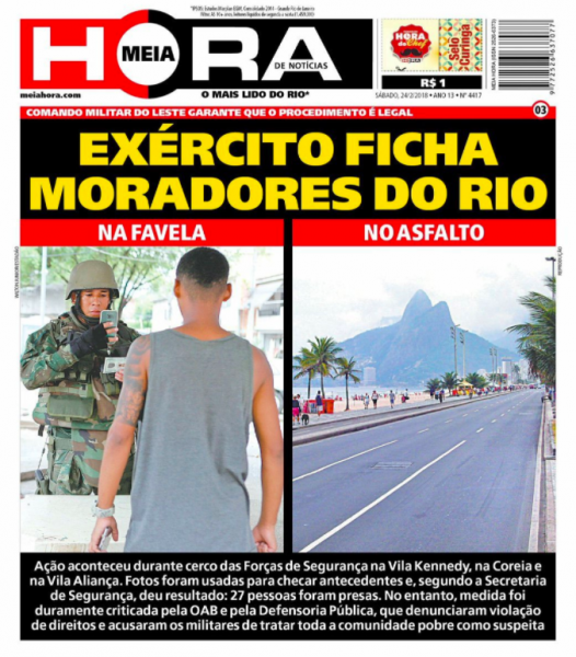 O jornal Meia Hora, que se apresenta como o mais lido do Rio, definiu, em duas fotos, o que representa a intervenção militar no Rio de Janeiro. Os militares ficham moradores da cidade. No asfalto, ninguém. Nas comunidades pobres, todos fotografados.