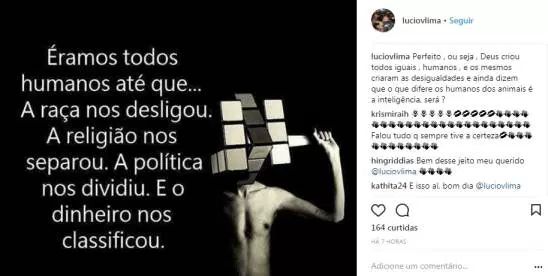 Denunciado pela Procuradoria-Geral da República, assim como Geddel, Lucio Vieira Lima filosofou em sua conta no Instagram sobre a atual situação do país.