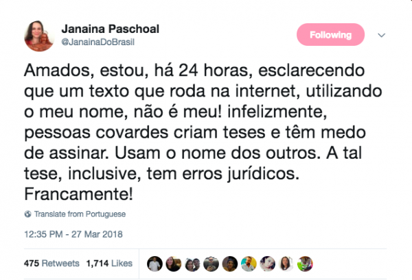 Janaína Paschoal está avisando seu distinto público que não é autora de um texto que está circulando na Internet.