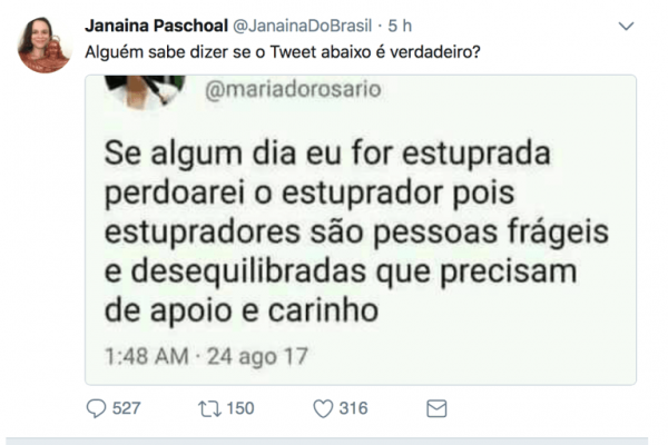 Em agosto passado, Janaína postou em sua conta no Twitter uma montagem grosseira que colocava na boca de Maria do Rosário uma mensagem em que ela diz que “perdoaria” alguém que a estuprasse porque “estupradores são pessoas frágeis e desequilibradas, que precisam de amor e carinho”.