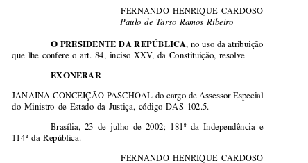 Janaína exerceu, por duas ocasiões, cargos comissionados em governos tucanos. No segundo mandato do governo de Fernando Henrique Cardoso (PSDB), a advogada atuava como assessora especial do ministro da Justiça, tendo sido exonerada em 2002, conforme consta neste arquivo do Diário Oficial da União.