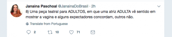 A “jurista” Janaína Paschoal gastou 38 tuítes para dizer que a exposição Queermuseu — deveria ser permitida apenas a maiores de idade — e a performance do homem nu no MAM violaram a lei — “Os muitos abusos (que nem sempre implicam penetração) ocorrem em contextos lúdicos, nos quais a criança não percebe estar sendo abusada”. Livre docente da USP, Janaína deveria ser mais cuidadosa não com a opinião, que é livre, mesmo quando se diz absurdos, mas com o Português. Escreveu “expectadores” no sentido de espectadores. Tropeço grave para quem parece se achar o oráculo de parte da sociedade. “Muitos escreveram, perguntando sobre a tal exposição com o homem nu”, disse, ao iniciar sua dissertação de 38 tuítes.