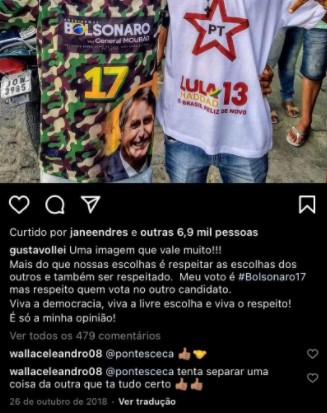 “Uma imagem que vale muito!!! Mais do que nossas escolhas é respeitar as escolhas dos outros e também ser respeitado. Meu voto é #Bolsonaro17 mas respeito quem vota no outro candidato. Viva a democracia, viva a livre escolha e viva o respeito! É só a minha opinião!”.