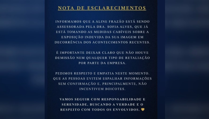 Em nota, a defesa da funcionária declarou que está tomando medidas legais contra a exposição pública de sua imagem. O comunicado destaca que Aline não foi demitida e pediu respeito e empatia diante do caso, que segue sob apuração.