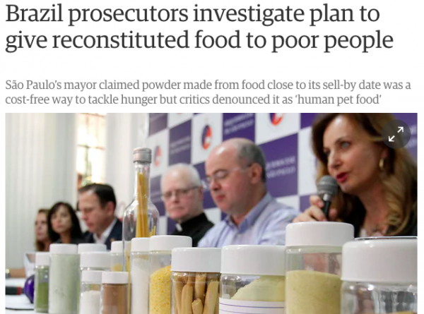 A promotoria da maior cidade do Brasil abriu um inquérito sobre um plano controverso para alimentar os cidadãos e estudantes mais pobres com uma farinha feita de alimentos perto de sua data de vencimento, que os críticos descrevem como “ração humana”.