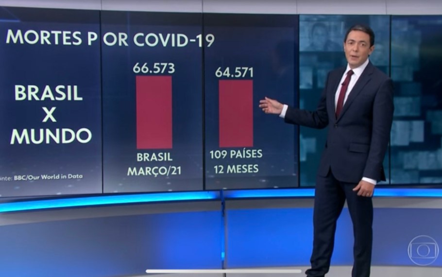 Jornal Nacional destaca que covid matou mais brasileiros em março do que em 109 países em 12 meses