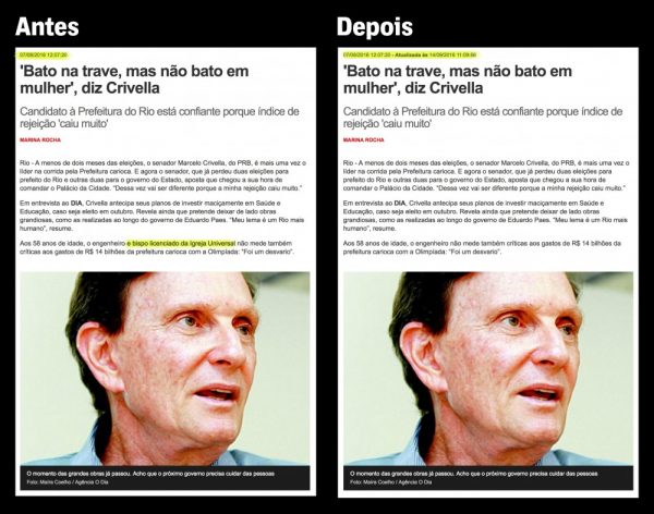 As alterações das reportagens do site de “O Dia” coincidiram com um período em que a campanha do primeiro turno das eleições de 2016 esquentava. Naquela época, o Ibope divulgara a segunda pesquisa da corrida pela prefeitura do Rio, consolidando Crivella na liderança, com mais de dez pontos percentuais à frente do segundo colocado. O candidato do PRB, porém, ainda tinha que lidar com um índice de rejeição de 24%, quarto maior entre os 11 postulantes ao cargo. Por e-mail, o presidente de “O Dia”, Marcos Salles, negou qualquer interferência política no conteúdo editorial do jornal.