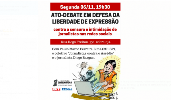 O jornalista Diego Bargas e o promotor Paulo Marco Ferreira Lima estarão daqui a pouco no Sindicato dos Jornalista de São Paulo para um debate sobre o assédio a profissionais da imprensa nas redes sociais. Diego foi demitido da Folha de S. Paulo depois de ser massacrado no Facebook e Twitter por Danilo Gentile e seguidores. Motivo: estavam descontentes com a crítica de Diego Barbas sobre um filme produzido e estrelado pelo apresentador. O promotor Paulo Marco Ferreira Lima comanda uma investigação sobre haters que ameaçam jornalistas. “O objetivo é coibir o que é o hater, assegurado o direito de liberdade de expressão, mas não a liberdade para cometer crime”, diz. O promotor começou a identificar os agressores a partir de uma denúncia feita pelo jornalista Mauro Cezar Pereira, da ESPN. O debate começa às 19h30, na rua Rego Freitas, 530, sobreloja, São Paulo.