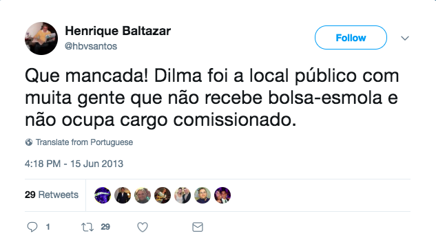 Denuncia o “propinoduto” do PT e a “perseguição” aos cristãos no mundo e replica qualquer coisa pró Bolsonaro. Em 2013, detonou Dilma pela “mancada” de ter ido a um “local público com muita gente que não recebe bolsa esmola e não ocupa cargo comissionado”.