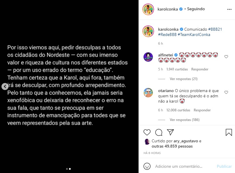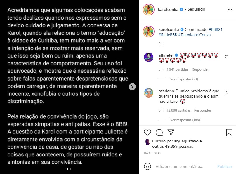 Karol Conká foi duramente criticada na internet nesta sexta-feira (29) por causa de comentários feitos no BBB 21 (Globo). A cantora foi acusada de xenofobia ao falar sobrea colega de confinamento Juliette Freire, que é paraibana.