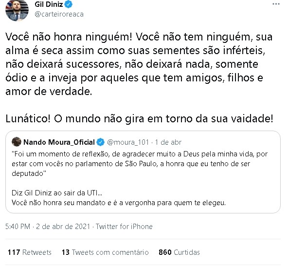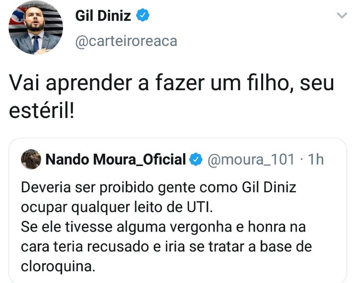Em outro tuíte, Diniz chamou Moura de “estéril” e afirmou que ele deveria “aprender a fazer um filho”.