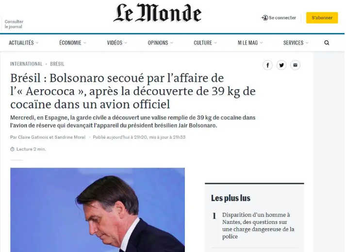 “Bolsonaro abalado pelo caso ‘Aerococa’, depois que 39 kg de cocaína foram encontrados em um avião oficial” foi o título dado pelo diário parisiense.